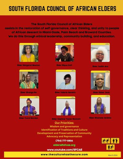 The South Florida Council of African Elders restores self-governance, clear thinking, and unity to people of African descent in Miami-Dade, Palm Beach and Broward Counties. We do this through ethical leadership, community building, and education.
